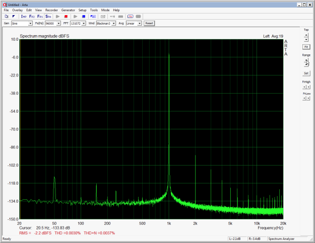 Voor het digitale gedeelte wordt de 3.3V aansluiting van de Raspberry PI gebruikt en voor het analoge gedeelte wordt de 5V aansluiting gebruikt. Door gebruik te maken van een Ultra-low-noise voltage regulator voor het analoge deel wordt de Total Harmonic Distortion (THD) oftewel de vervorming, gemeten onder de 0.003% en bij THD+N (vervorming + ruis) blijft dit beperkt tot 0.0037%. Hier moet dan de ruis van de meetapparatuur nog vanaf! Heel erg goed dus en zelfs met de meegeleverde powersupply komt dit in de meting niet boven de 0.004%!